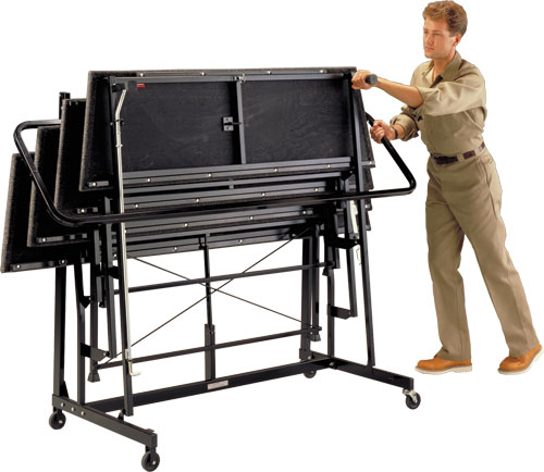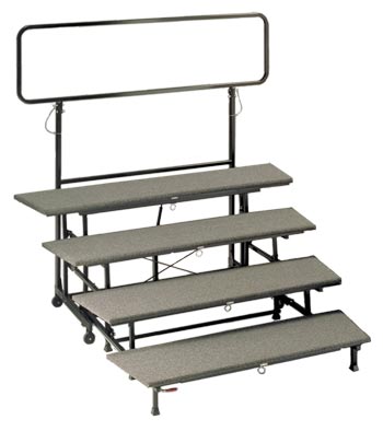 Just roll each self-contained 3, or 4 step unit into place, lower the steps with one fluid motion to the floor, lock it to the next unit, and you are ready to sing. When in the use position, each unit rests on 10-12 solid points of contact, so risers remain solid and quiet. Each step is fully carpeted and positioned to keep heels from slipping off the back edge.